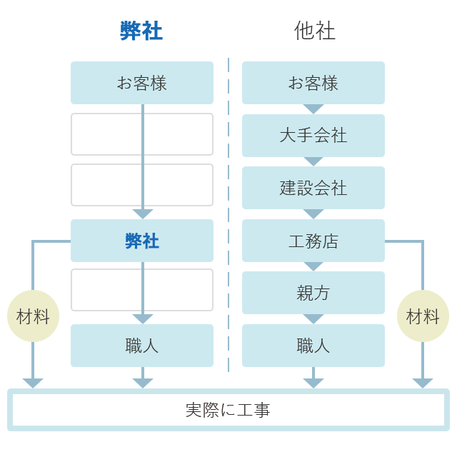 材料支給型の材工分離発注方式工法を採用し、コストを抑え短納期で工事に取り掛かれます。